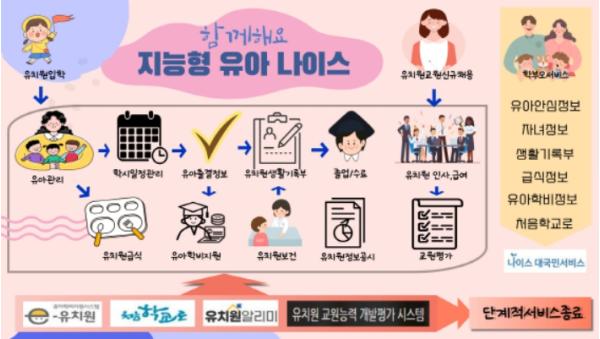 유아나이스 시스템은 △유치원 교무업무 △학교 행정 △유아 학비 △학부모 서비스와 민원 등을 전산화한 것으로 행정정보공동이용시스템을 활용하여 유아의 주소 정보와 건강정보 등과 연계되어 교원 업무를 경감 하는 자동화 기능을 포함하고 있다.
