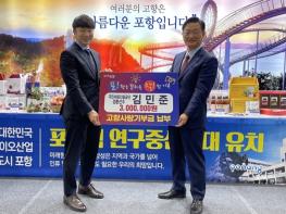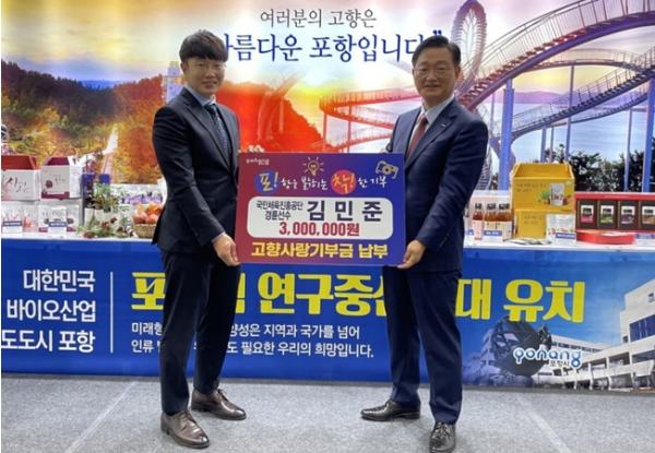 포항시에 따르면 김민준 선수는 지난 9일 대구 엑스코에서 열린 ‘2023 고향사랑박람회’ 기념식에 참석해 기부금 300만 원을 전달했다.