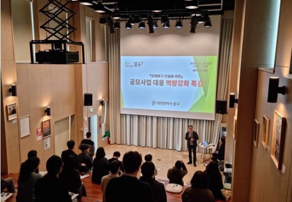 대전 중구는 10일 대전커먼즈필드에서 공모사업 담당자 등 40여 명을 대상으로 ‘미래중구 건설을 위한 공모사업 대응 역량강화 특강’을 실시했다고 밝혔다.