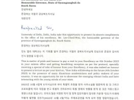 지난 10월 4일 경북도청을 방문해 ‘인도의 미래 발전상’을 주제로 도청 공무원 및 유관 기관장 등을 대상으로 강연을 한 인도 델리대학교의 요게쉬 싱(Yogesh Singh) 부총장이 이철우 도지사에게 감사 서한문을 보내왔다.