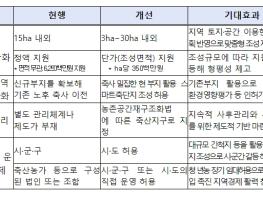 둘째 노후 축사가 밀집한 지역도 재개발 방식을 통해 지능형(스마트)축산단지로 조성할 수 있도록 했다. 이에 따라 신규 부지 확보로 인한 민원이 대폭 감소하고 환경영향평가 등 관련 인·허가 절차가 간소화되어 사업 추진에 탄력을 받을 것으로 기대된다.