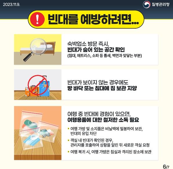 빈대 특성상 사람이 많이 모이는 곳이나 일상생활 공간에서도 빈대가 발생할 수 있으므로 빈대를 예방하려면 청결한 환경 유지와 주기적인 소독이 중요하고, 여행 중 빈대에 대한 경험이 있으면 여행용품에 대한 철저한 소독이 필요하다.