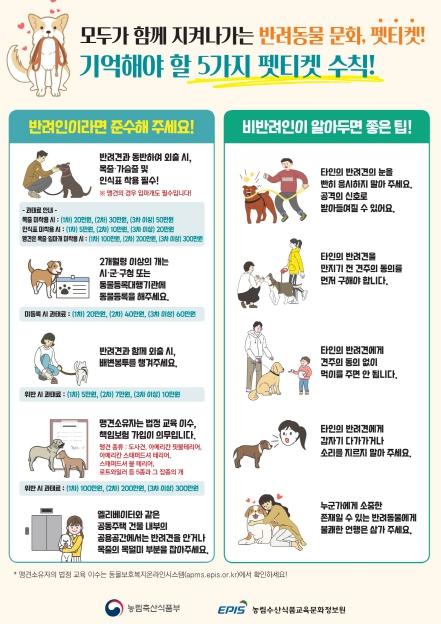 반려견의 목줄 미착용 등 안전조치를 하지 않는 경우 최대 50만 원, 배설물 미수거 시 최대 10만 원, 반려동물을 등록을 하지 않은 경우 최대 60만 원의 과태료가 소유자에게 부과된다.