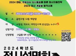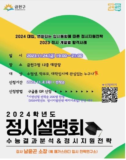 금천구는 11월 24일 19시 구청 대강당에서 2024학년도 정시 대비 입시설명회를 개최한다고 밝혔다.