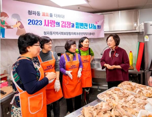 남영동은 8일 다문화 가족과 김치 버무림 및 시식을, 효창동은 9일 주민센터 앞마당에서 효창어린이집 아이들과 김치 버무림 체험 행사를 가졌다. 같은날 청파동은 밑반찬, 원효로1동은 돈가스 나눔도 겸했다.