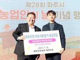 장단콩웰빙마루에서 개최된 농업인의 날 기념행사 후 열린 전달식에는 민승호 대한한돈협회 파주지부장을 비롯한 관계자 등이 참석했다. 대한한돈협회 파주지부는 제28회 농업인의 날(11.11)을 맞아 어려운 이웃을 위해 성금 기탁을 결정했다며, 성금은 파주시 관내 저소득층을 위해 써달라는 뜻을 전했다.