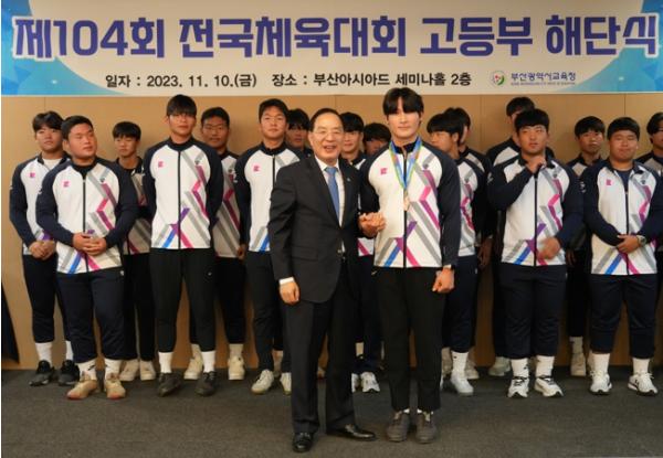 부산광역시교육청은 지난 10일 오후 4시 연제구 아시아드시티 세미나홀에서 입상 학생, 학교장, 지도교사, 지도자 등 160여 명이 참석한 가운데 ‘제104회 전국체육대회 고등부 해단식’을 개최했다.