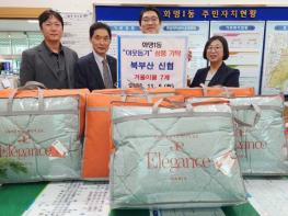 북구 화명1동 행정복지센터는 지난 6일 북부산 신협 수정본점에서 어려운 이웃들이 따뜻한 겨울을 보낼 수 있도록 겨울 이불 7채를 전달했다고 밝혔다.