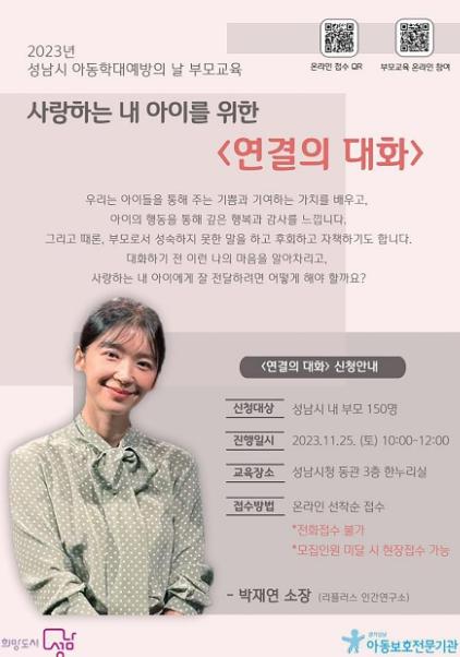 이날 초빙 강사인 박재연 리플러스 인간연구소장이 ‘사랑하는 내 아이를 위한 연결의 대화’를 주제로 한 강연을 펼친다.
