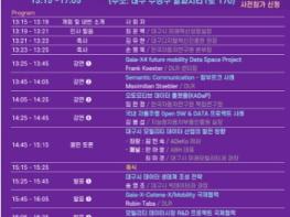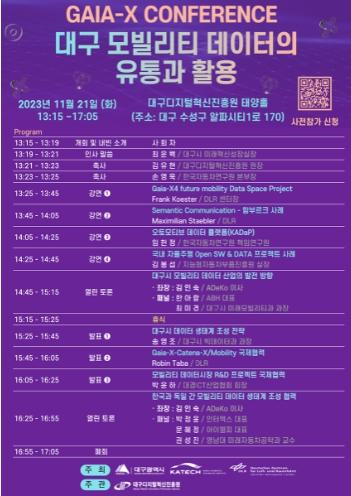 세미나는 ▲(1부) ‘연결된 미래’ Gaia-X와 국내 모빌리티 플랫폼 주제의 전문가 강연(?Gaia-X4 future mobility Data Space Project(Frank Koester-DLR) ?Semantic Communication : 함부르크 사례(Maximilian Staebler-DLR) ?오토모티브 데이터 플랫폼(KADaP) : 국내 자동차 데이터 생태계 활성화 전략(한국자동차연구원) ? 국내 자율주행 Open SW&DATA 프로젝트 사례(지능형자동차부품진흥원)) 및 ‘대구시 모빌리티 데이터 산업의 발전방향’에 대한 열린 토론, ▲(2부) ‘이어지는 협력’ 국제 데이터 파트너쉽 구축 주제의 전문가 발표(?대구시 데이터 생태계 조성 전략(市 빅데이터과) ?Gaia-X/Catena-X/Mobility 국제협력(Robin Taba-DLR) ?모빌리티 데이터시장 R&D 프로젝트 국제협력(대경ICT산업협회)) 및 ‘한국과 독일 간 모빌리티 데이터 생태계 조성 협력’을 위한 열린 토론 순으로 진행된다.
