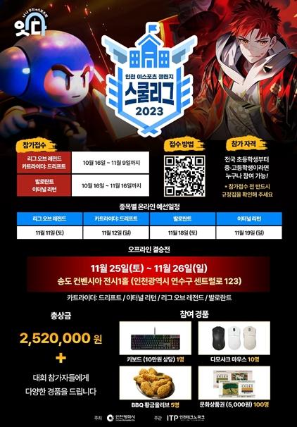 인천광역시가 주최하고 인천테크노파크가 주관하는 ‘2023 인천 이스포츠 챌린지 스쿨리그’가 오는 11월 25과 26일 양일간 송도컨벤시아 전시1홀에서 개최된다.