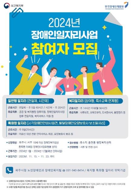파주시는 11월 15일부터 23일까지 장애인의 사회참여 확대와 소득안정을 지원하기 위해 2024년 장애인일자리사업 참여자를 모집한다.