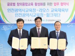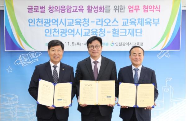 인천광역시교육청은 글로벌 창의융합교육활성화를 위해 라오스 교육체육부, 헐크파운데이션과 업무협약을 맺었다고 14일 밝혔다. 9일 시교육청 교육감실에서 열린 협약식에는 도성훈 교육감과 이만수 헐크파운데이션 이사장, 이승복 교육이음센터장이 참석했다.