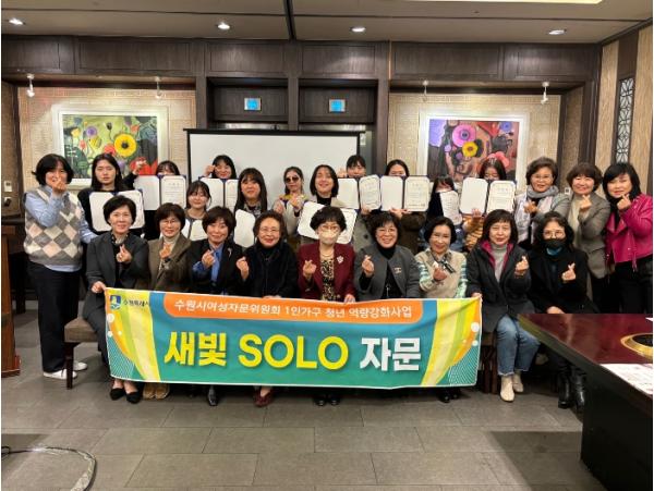 수원시가 수원시여성자문위원회와 함께 수원시 1인 가구 청년 16명을 대상으로 역량 강화 교육으로 진행된 ‘새빛 솔로(Solo) 자문’ 수료식이 15일 인계동 한 음식점에서 열렸다.