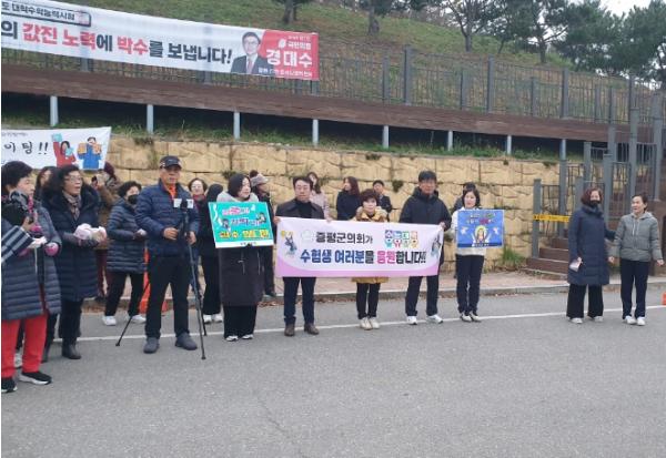 이동령 의장을 비롯한 의원들은 오전 7시부터 형석고 앞에서 “수험생 여러분을 응원합니다”라는 문구를 적은 현수막과 피켓을 들고 수험생들의 선전을 기원했다.