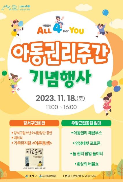 아울러 행사기간 내내 2023년 아동권리 그림 전시회가 열려 지난해 아동권리 포스터 공모전 수상작을 게시한다. 18일에는 강서구민회관 우장갤러리에서, 19일~24일은 발산역 2번출구 지하보도에서 진행된다.