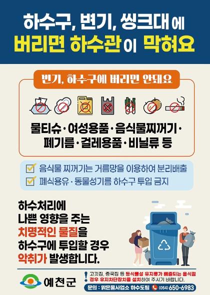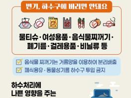 물티슈, 여성용품, 동식물성 기름 등이 하수도로 배출되는 경우 하수관로가 막혀 역류 및 악취가 발생하며, 하수처리시설 설비가 망가져 하수처리에 큰 어려움이 생기는 등 큰 피해가 발생하므로 이를 예방하기 위한 주민들의 적극적인 참여가 필요하다.