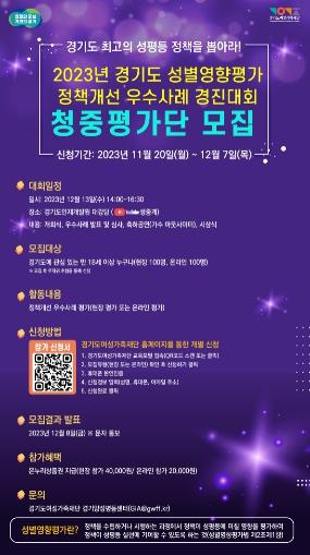 경기도가 11월 20일부터 12월 7일까지 ‘2023년 성별영향평가 정책개선 우수사례 경진대회’에 참여해 우수 정책개선 사례를 평가할 청중평가단 200명을 모집한다.