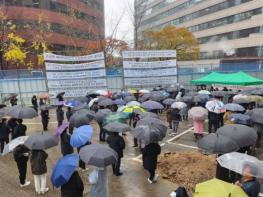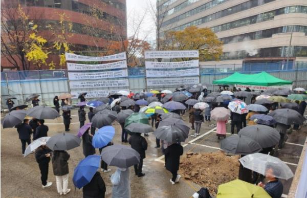 지난 16일 오후 2시 중구 소공동 행정복합청사 건립 예정지에는 겨울비 내리는 궂은 날씨에도 불구하고 주민 100여 명이 모여 ‘부영그룹 소공동 행정복합청사 건립 방해 규탄대회’를 열었다.
