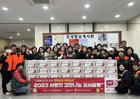 임실군자원봉사센터가 지난 16일 임실군여성봉사회, 적십자봉사회임실지구협의회, 자유총연맹여성회, 임실여성의용소방대, 임실여성자율방범대, 새마을부녀회, 자율방재단 등 15개 자원봉사단체 및 기관의 봉사자 40여 명이 참가한 가운데‘2023 사랑의 김장 나눔 봉사활동’을 실시했다.