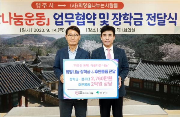 영주시와는 9월 14일 업무협약을 체결하고 저소득층 20명에게는 2년간 매월 5만 원씩 2400만 원의 장학금을 지원하고 아동 3명에게 360만 원 상당의 컴퓨터를 전달했으며 앞으로도 다양한 지원을 약속했다.