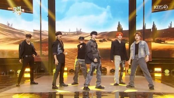 저스트비(임지민, 이건우, 배인, JM, 전도염, 김상우)는 17일 방송된 KBS 2TV ‘뮤직뱅크’에 출연해 미니 4집 ‘÷ (NANUGI)’(나누기) 타이틀곡 ‘MEDUSA’(메두사) 무대를 공개했다.