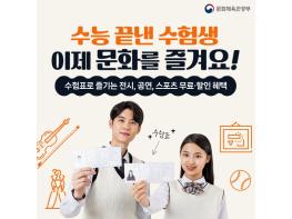 문화체육관광부가 수험생 여러분을 위해 마련한 다양한 문화 행사와 혜택들을 누리며 스트레스와 피로를 풀고, 문화충전도 빵빵하게!