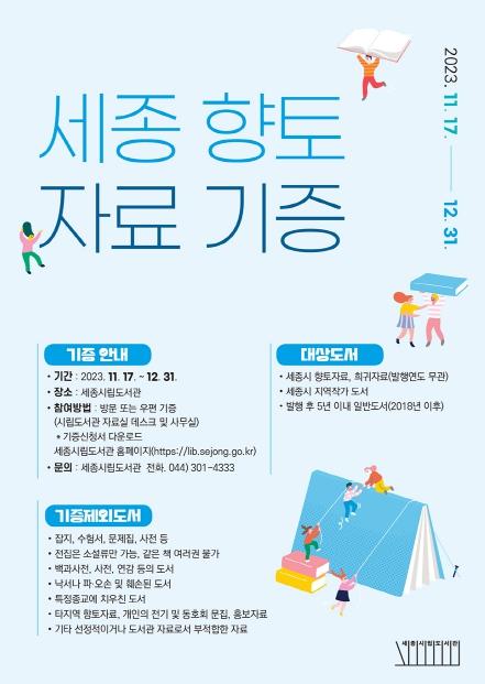 시립도서관은 도서관 4층에 향토자료실을 마련하고, 이번 기증 운동을 통해 세종시의 역사, 문화, 인물 등과 관련된 보존·가치 있는 향토자료와 지역작가 도서 등을 수집한다.