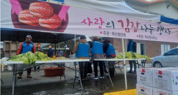 학산면 청년회(회장 양덕모)는 지난 20일 학산면사무소에서 청년회 회원들이 참여한 가운데 김장 김치 150포기를 담갔다. 회원들이 직접 경로당 34개소를 방문하여 김장 김치를 전달했다.