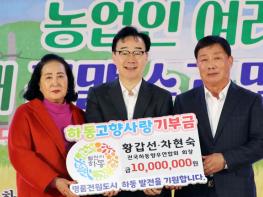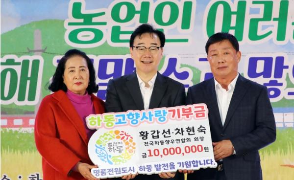 황갑선 회장 부부는 지난 17일 하동실내체육관에서 열린 제28회 농업인의 날 기념식 및 농업인 한마음 대회에 참석해 기부금을 기탁하며 향우들의 고향사랑 고액기부를 이어갔다.