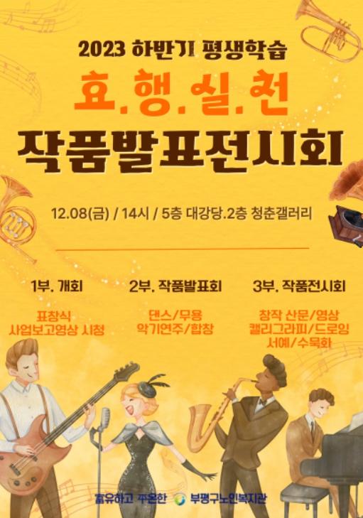 인천시 부평구노인복지관은 2023년 하반기 평생학습 프로그램 종강식을 기념하여 어르신들이 배우고 익힌 효행실천 작품발표회 및 전시회를 12월 8일 200여명이 참석한 가운데 진행한다고 밝혔다.