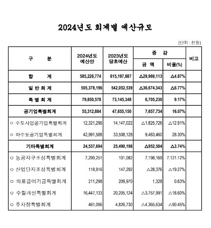 이는 올해 당초예산 6,151억원 대비 299억원(△4.87%) 감소한 것으로써, 군의 일반적인 재정을 담고 있는 일반회계는 5,053억원이며, 특별회계는 798억원이다.