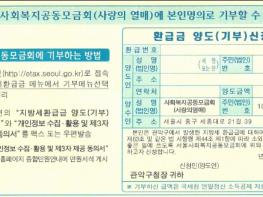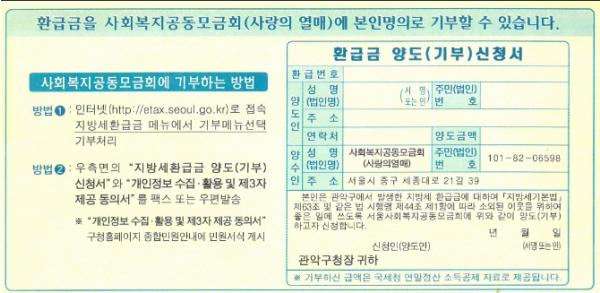 환급금을 사회복지공동모금회에 기부할수도 있다. 서울시ETAX 지방세환급금 메뉴에서 ‘기부’메뉴를 선택해 기부처리 할 수 있으며 환급통지서에 동봉된 환급금 양도(기부) 신청서를 작성해 구청에 우편(후납), 팩스로 제출해도 된다.