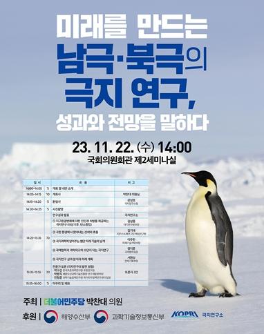 오는 22일 국회의원회관 제2세미나실에서 국회 과학기술정보통신위원회 소속 박찬대 의원 (인천연수갑·더불어민주당 최고위원)이 주최하고, 과학기술정보통신부·해양수산부·극지연구소가 후원하는 『미래를 만드는 남극·북극의 극지연구, 성과와 전망을 말하다』정책 토론회가 열린다.