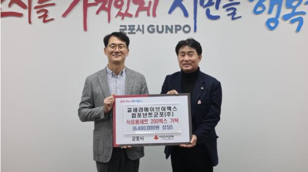 군포시는 지난 20일 고산로에 위치한 휴대폰 안테나 제조회사 교세라에이브이엑스컴포넌트군포(주)로부터 레토르트 식품 등 다양한 식료품이 담긴 식료품세트 200개(648만원 상당)를 기탁받았다.