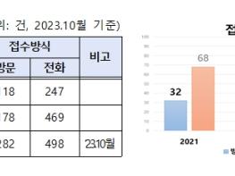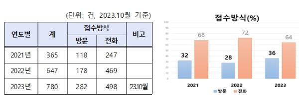 이는 지난해 647건보다 133건이 늘어난 것으로, 전화민원은 498건(64%), 방문민원은 282건(36%)이다. 그중 방문민원은 지난해 178건 보다 104건, 8%p(28%→36%) 증가한 것으로 나타났는데, 이는 사회적 거리두기 폐지 이후 시청 앞 집회·시위의 증가 등 방문민원이 늘어난 결과로 풀이된다. 또한 구청, 행정복지센터 등 기초지자체 상담으로 해결이 어려운 개인고충 방문상담 민원이 증가한 것도 원인으로 파악된다.