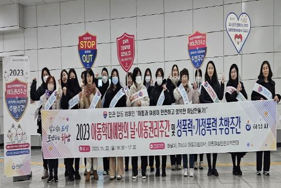 민관 합동으로 진행한 이번 캠페인은 아동학대 근절, 아동권리 증진, 성폭력·가정폭력 추방을 주제로 사회적 인식을 개선하고 아동과 여성이 안전하고 행복한 하남시를 구축하기 위해 피켓 홍보 및 물품 배부 등의 캠페인을 진행하며 시민들을 대상으로 사회적 관심을 촉구했다.