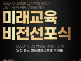 인천광역시교육청은 서울, 광주, 대전, 울산, 세종, 강원, 전북, 전남, 경북, 제주 10개 시도교육청 및 한국지능정보사회진흥원과 인공지능 맞춤형 교수학습 플랫폼 중심의 비전 공유와 협업체계 구축을 위한 미래교육 비전선포식을 송도센트럴파크호텔에서 23일 개최한다.