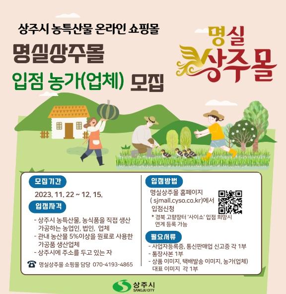 상주시는 11월 22일부터 12월 15일까지 농특산물 온라인 쇼핑몰인 “명실상주몰”에 입점할 농가와 업체를 모집한다.
