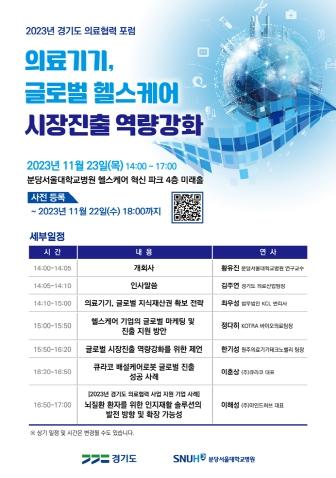 경기도가 23일 분당서울대학교병원 헬스케어혁신파크 미래홀에서 ‘의료기기, 글로벌 헬스케어 시장진출 역량강화’를 주제로 경기도 의료협력 정기포럼을 개최한다.
