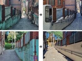 안심골목길은 기존 경사도가 심한 골목길에 벽부형 2열 안전손잡이와 미끄럼방지 포장재로 낙상사고를 예방할 수 있게 하고 하향 간접조명 방식의 동작감지센서 골목비추미와 측광석 바닥재를 설치해 주민이 안심하고 다닐 수 있는 공간으로 만들었다.