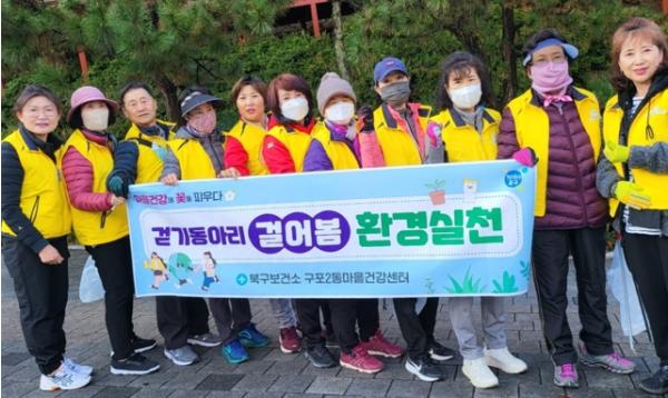 부산 북구보건소은 17일 구포2동 마을건강센터 걷기동아리 ‘걸어봄’과 함께 구포2동 일원에서 환경정비 활동(플로깅)을 추진했다.