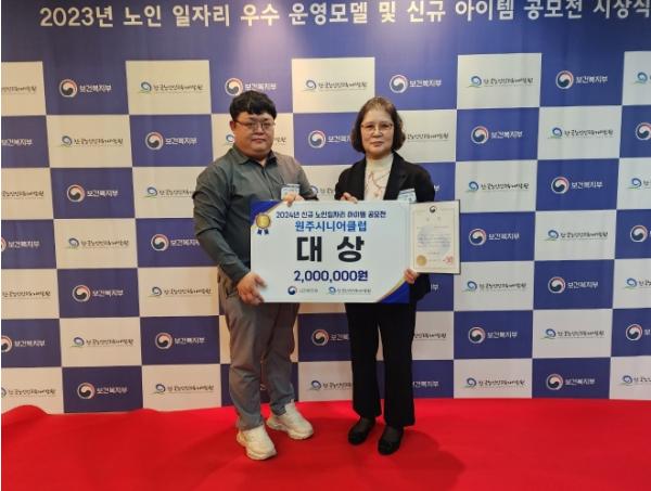 원주시니어클럽은 '2024년 노인일자리 및 사회활동 지원사업 신규 노인일자리 아이템 개발 공모전'에서 ‘취약계층 금융신용회복 서포터즈’로 참가해 보건복지부 장관상을 수상했다.