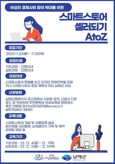 남해군은 오는 11월 30일까지 여성친화도시 조성 사업의 일환으로 추진하는 ‘스마트스토어 셀러되기 AtoZ 사업’에 함께할 참여자를 모집한다고 밝혔다.