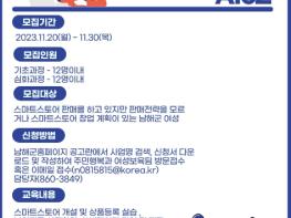 모집인원은 기초과정 12명, 심화과정 12명 이내로, 스마트스토어를 운영하고 있으나 판매 전략을 잘 모르거나, 스마트스토어를 창업할 계획이 있는 남해군 거주 여성이면 누구나 신청할 수 있다.
