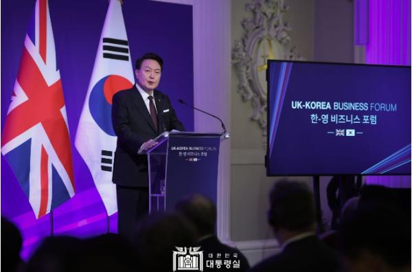 대통령은 비즈니스 포럼 축사를 통해 영국이 울산조선소와 고리원전 1호기 건설 등 대한민국의 산업화에 든든한 조력이 되어준 점과, 반도체?바이오?항공?방산?5G?해상풍력 등 첨단산업 분야에서 양국 기업 간 활발한 협력을 평가했다.