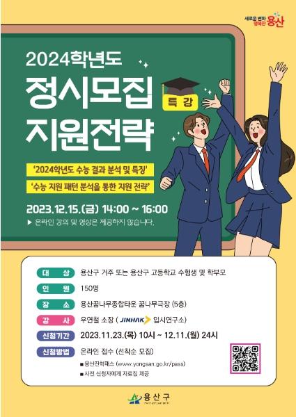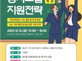 서울 용산구가 수험생 대학 합격을 지원하기 위해 ‘2024학년도 정시모집 지원전략 특강’과 ‘2024학년도 정시대비 1:1 전략컨설팅’을 준비했다.