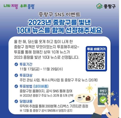 중랑구가 2023년 올해 중랑구를 빛낸 10대 뉴스를 선정하기 위해 이달 29일까지 투표를 진행한다.
