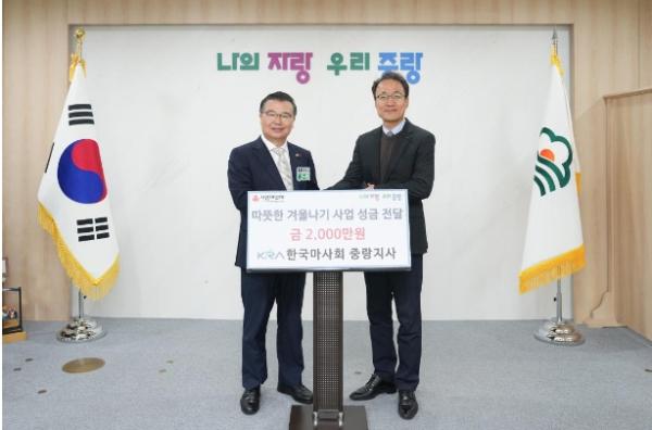 구는 한국마사회 중랑지사로부터 성금 2천만 원을, 순복음 강북교회(담임목사 전호윤)로부터 백미 10kg 200포를 전달받았다.