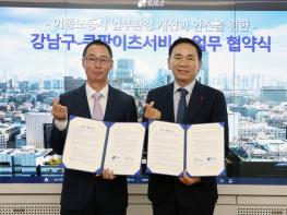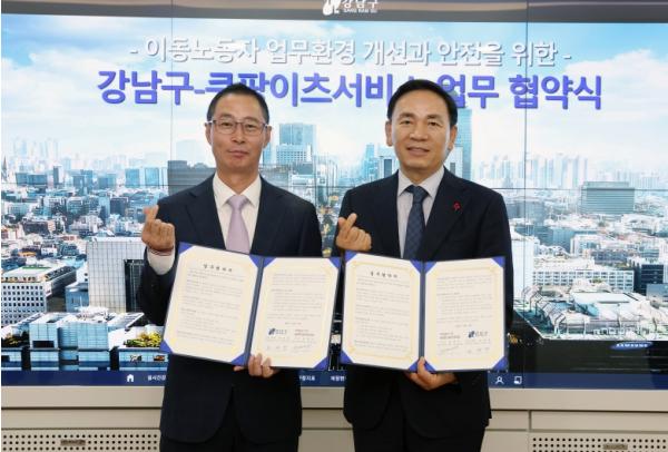 꿈이 모이는 도시, 미래를 그리는 강남구가 23일 배달서비스 전문업체인 쿠팡이츠서비스와 업무협약을 체결하고, 오는 29일과 30일 강남 이동노동자 쉼터 2호점에서 이륜차 무상점검 안전 캠페인을 실시한다.